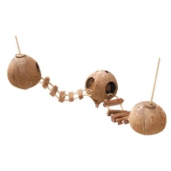 Die drei ausgehöhlte Kokosnüsse mit grossen Öffnungen sorgen für viel Abwechslung und Beschäsftigung. Mit den zwei Befestigungsseilen und den Karabinerhaken kann es leicht im Kleintierheim befestigt werden. Die einzelnen Häuser sind mit einer Holzleiter verbunden.