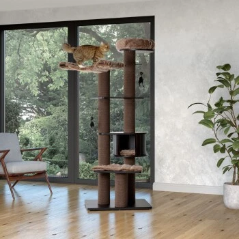 Der MORE Kratzbaum Harry ist schon auf den ersten Blick ein echter Hingucker: auf fünf verschiedenen Ebenen verteilen sich vielfältige Liegemöglichkeiten und laden somit zum ausgiebigen Klettern und Erkunden ein. Sowohl die Liegekissen als auch die integrierte Hängematte sind aus luxuriösem kuschelweichem Plüschstoff gefertigt und bieten dadurch ideale Möglichkeiten zum Beobachten und Entspannen. Bei Bedarf lassen sich die Kissen auch ganz leicht abnehmen und per Hand waschen. Die ca. 15cm breiten Kratzstämme sind mit robustem dunkelbraunem Seil ummantelt, was dem Kratzbaum seine elegante Optik verleiht. Die Bodenplatte des Kratzbaums ist mit kleinen Gummifüßen ausgestattet und schützt so den Boden. Die eleganten dunkelbraunen Farbtöne und die qualitativ hochwertige Verarbeitung machen diesen Kratzbaum zu einem langfristigen Lieblingsstück von dir und deinem Stubentiger – dank der vielfältigen Möglichkeiten zum Spielen, Kratzen, Entspannen und Beobachten.
